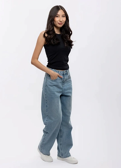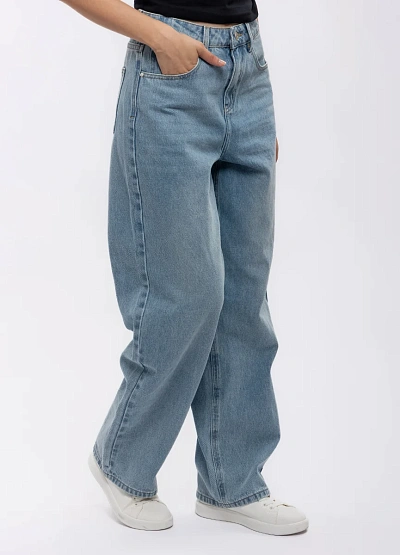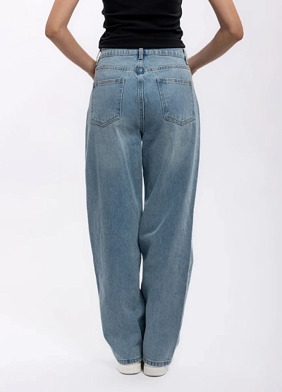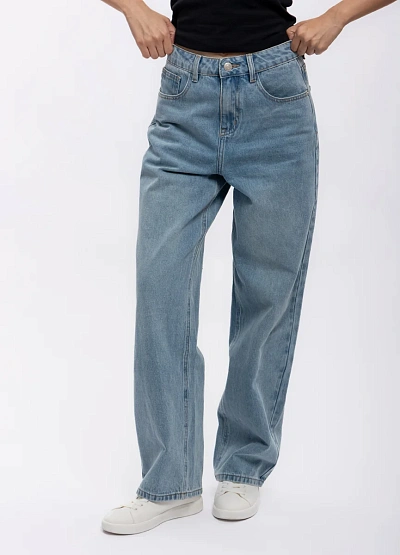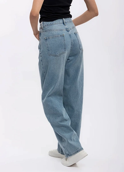 Женские джинсы свободного кроя в светло-голубой цветовой гамме. Модель отличается прямыми широкими штанинами и классическим дизайном, с заметной посадкой на талии и застежкой на пуговицу.