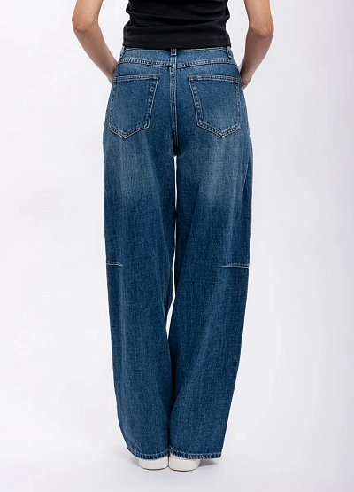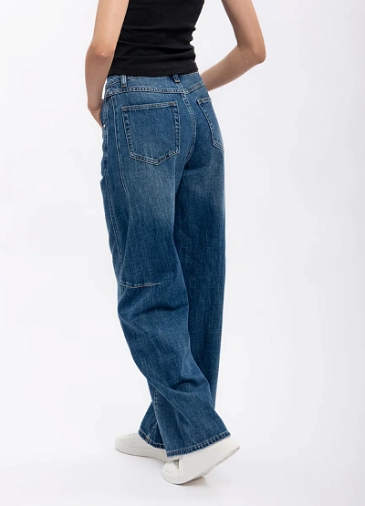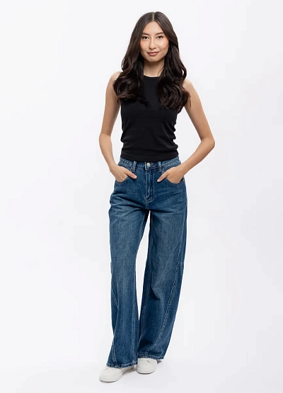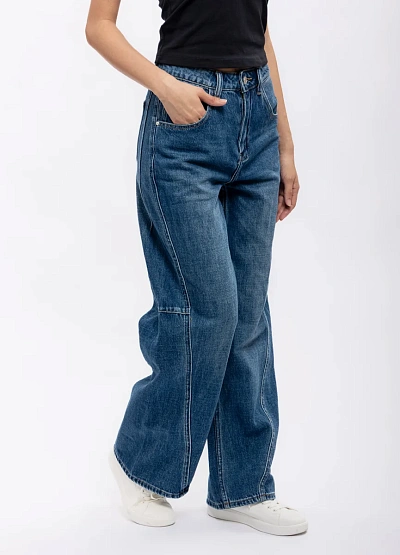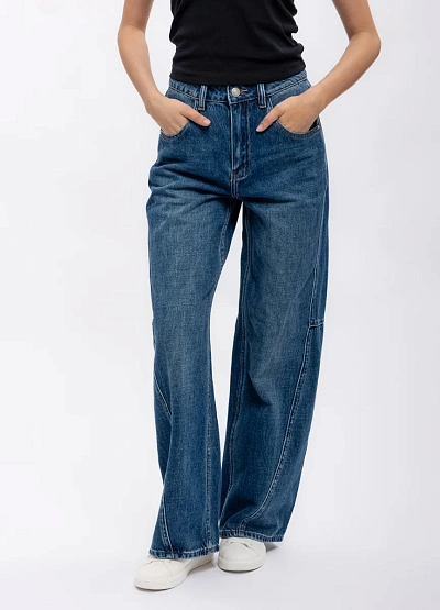 Женские джинсы свободного кроя в классическом синем оттенке. Модель отличается прямыми широкими штанинами и стандартной посадкой, что подчеркивает расслабленный стиль. Джинсы выполнены в однотонной гамме и имеют лаконичный дизайн.