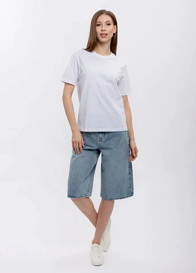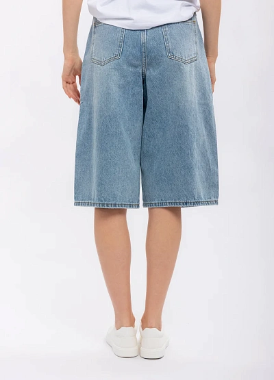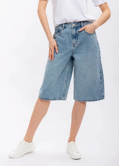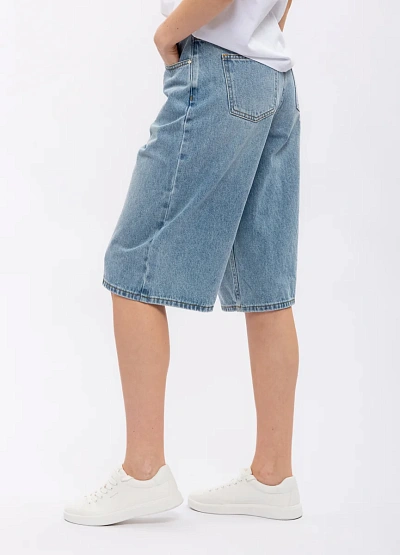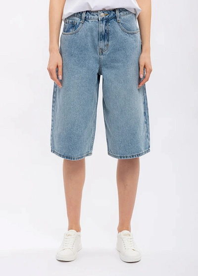 Женские джинсовые шорты свободного кроя в голубой цветовой гамме. Модель выполнена с классической посадкой на талии и длиной до колена, видимы накладные швы и отсутствие декоративных элементов.