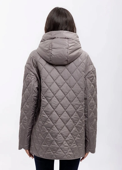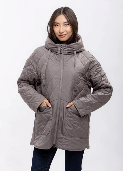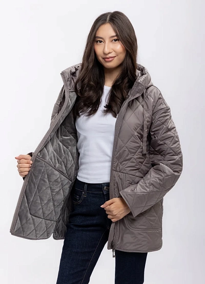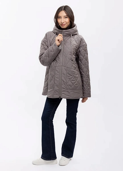 Женская куртка прямого кроя представлена в однотонной серо-глянцевой гамме. Модель с капюшоном и стёжкой, застёгивается на молнию и подходит для повседневного использования в прохладную погоду.