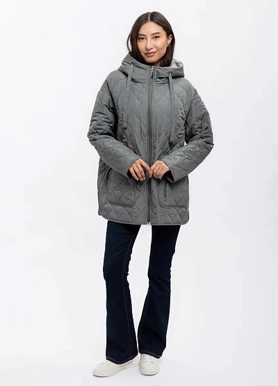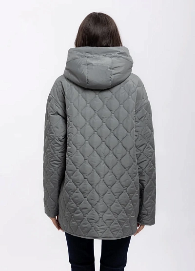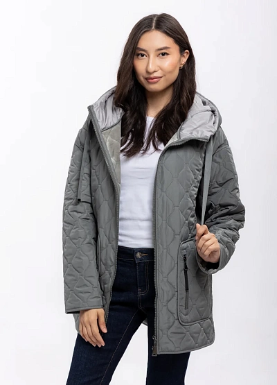 Женская утеплённая куртка прямого кроя в серой цветовой гамме. Модель выполнена с капюшоном и стёжкой ромбовидного узора, оснащена центральной молнией и накладными карманами на молнии.