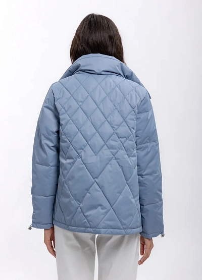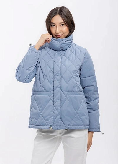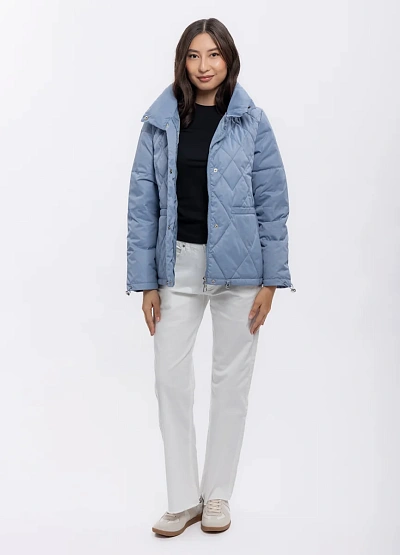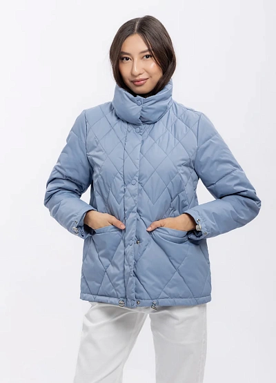 Женская куртка прямого силуэта светло-голубого цвета с характерной стёганой отделкой. Модель отличается объёмным воротником-стойкой и прорезными боковыми карманами, а также длиной до бедра.