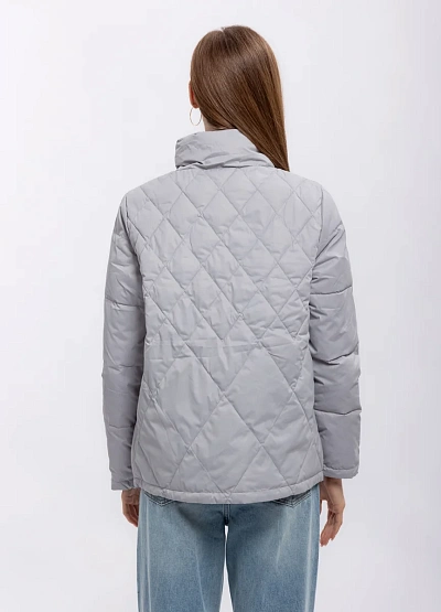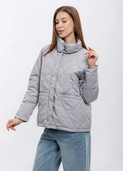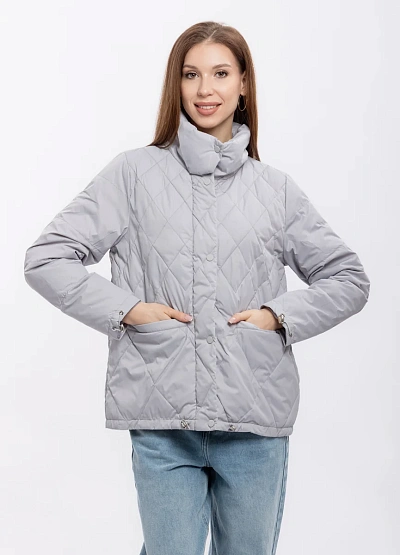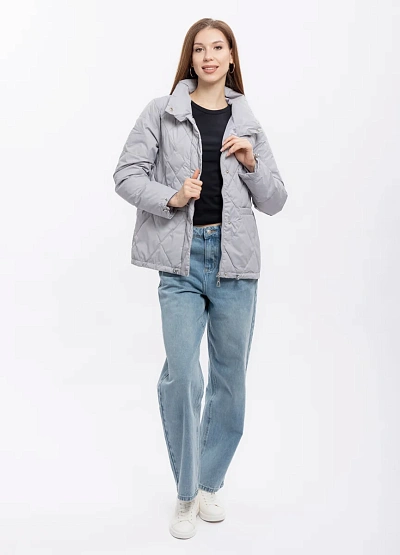 Женская куртка прямого кроя светло-серого цвета с объемным воротником. Модель выполнена в спокойной цветовой гамме с выразительной стежкой по всей поверхности, длина до бедра, застегивается на кнопки.