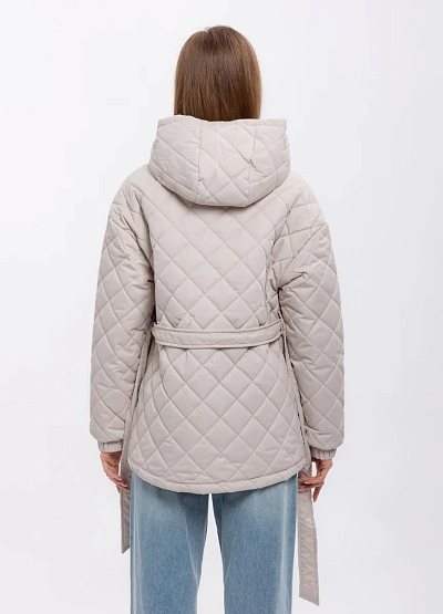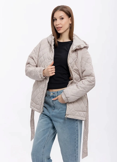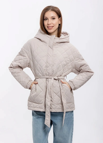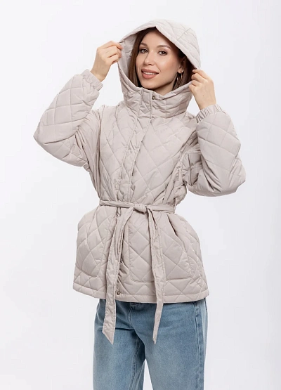 Женская стёганая куртка светлого оттенка подходит для повседневной носки. Модель выполнена в светло-бежевой гамме, со слегка объемным силуэтом и поясом на талии. Куртка оснащена капюшоном и имеет диагональный узор стёжки.