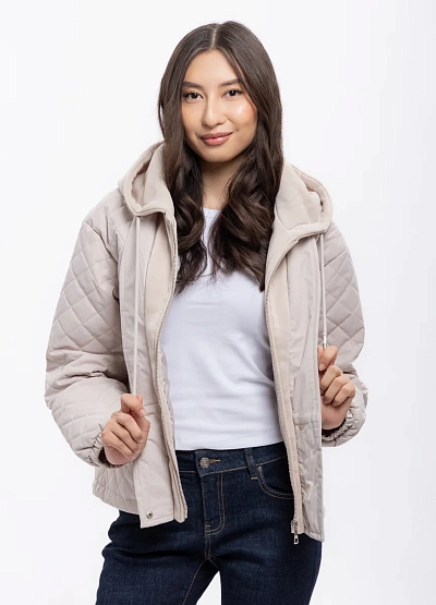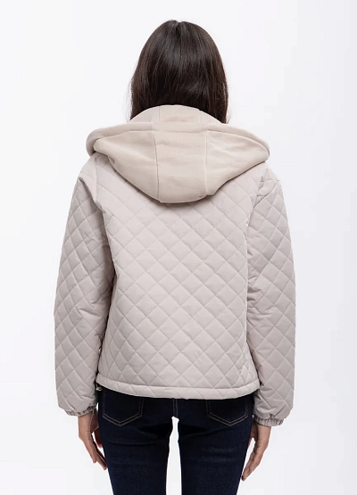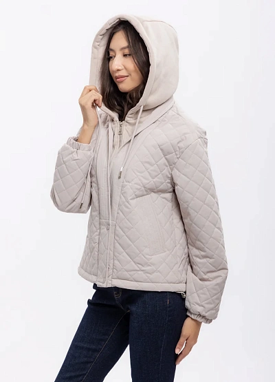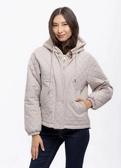 Женская стёганая куртка светло-бежевого цвета. Модель выполнена с капюшоном, центральной застёжкой на молнию и кнопках, имеет объёмный силуэт и простёжку ромбами. Куртка дополнена кулиской на капюшоне и боковыми карманами.