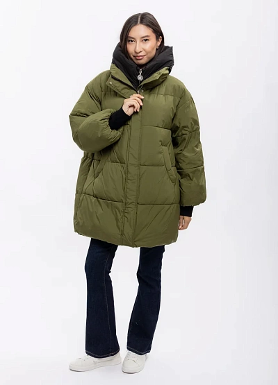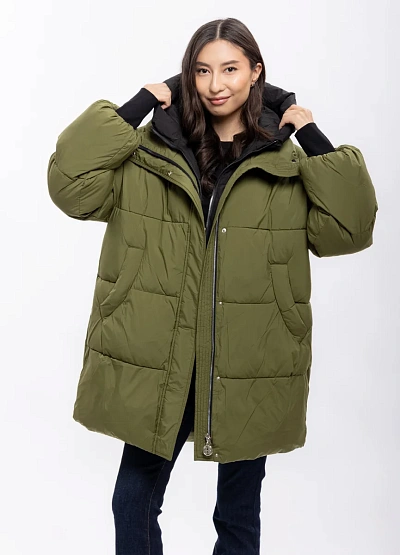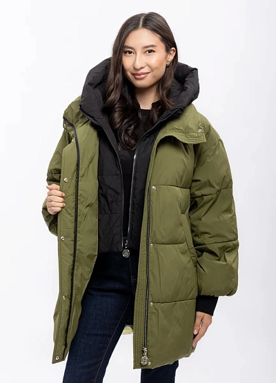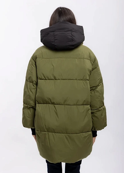 Женская удлинённая куртка выполнена в двухцветной гамме — оливковый снаружи и чёрный внутри. Модель отличается объёмным силуэтом, большими накладными карманами и высоким воротником-капюшоном.