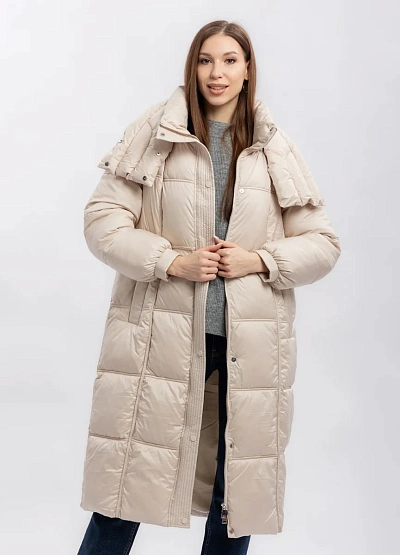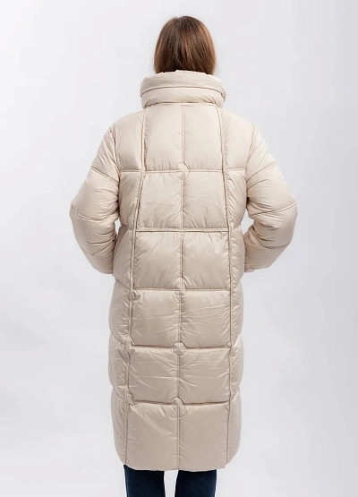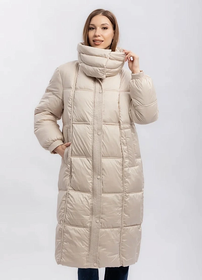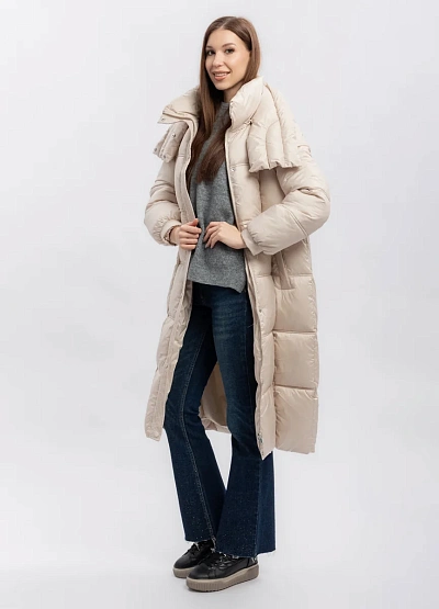 Женская куртка светлого бежевого оттенка выполнено в свободном силуэте. Модель выделяется объемным воротником-стойкой и длиной ниже колена, что придаёт современный вид.