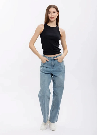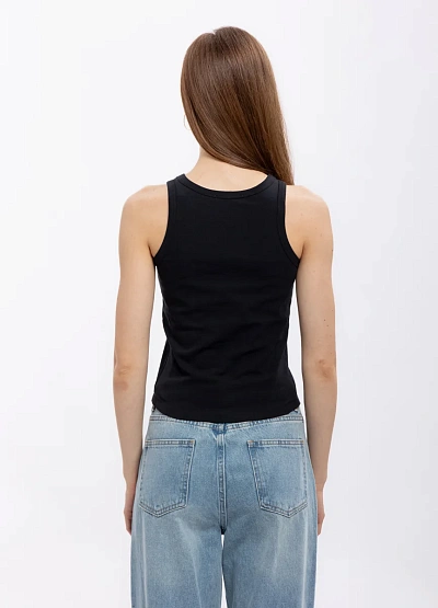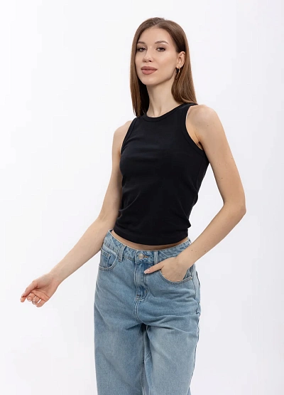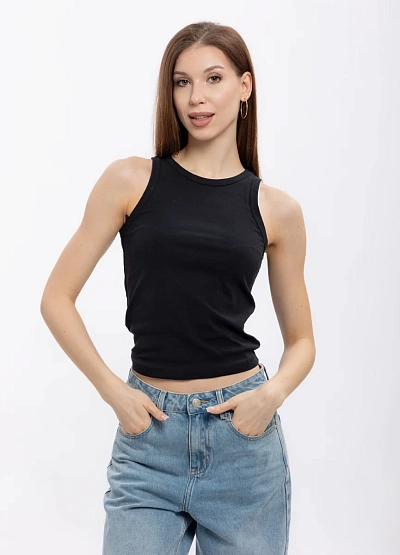 Женский кроп топ представлен в классическом чёрном цвете. Модель с прямым силуэтом и округлым вырезом, выполнена без рукавов и отличается лаконичным дизайном.