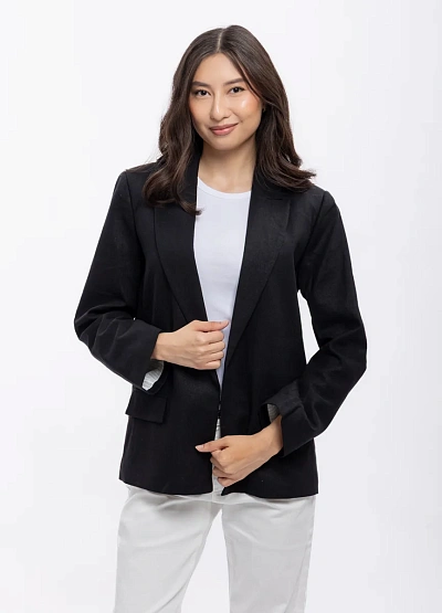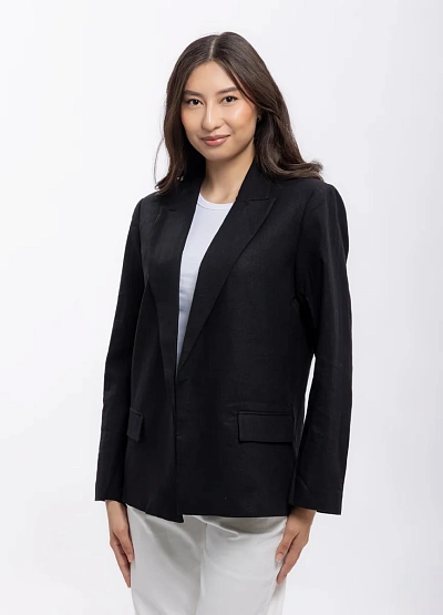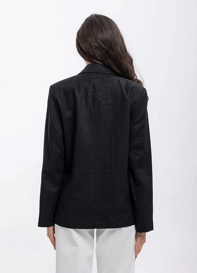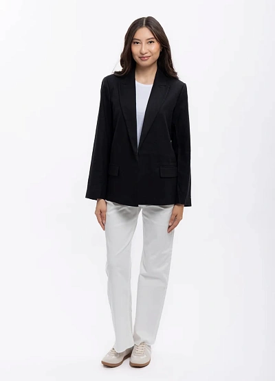 Женский пиджак прямого кроя выполнен в чёрном цвете. Модель имеет классический дизайн с длинными рукавами и лацканами, дополнена накладными карманами. Изделие выглядит универсально и уместно для создания различных образов.