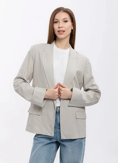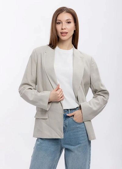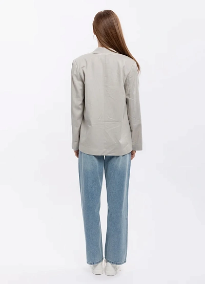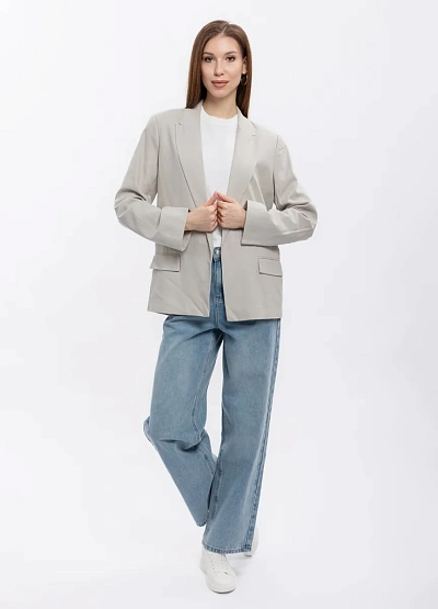 Женский пиджак прямого кроя представлен в светло-серой цветовой гамме. Модель отличается классическим дизайном с длинными рукавами и двумя накладными карманами с клапанами. Жакет дополнен прямыми линиями и лаконичным силуэтом.