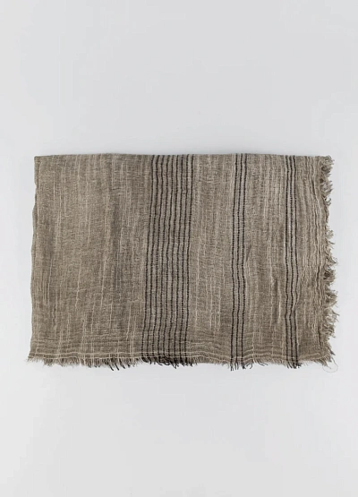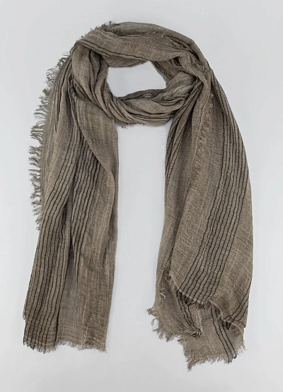 Универсальный шарф в нейтральной цветовой гамме песочно-серого оттенка. Модель отличается легкой текстурой, прямоугольной формой и ненавязчивыми темными полосами, расположенными по длине. Края изделия оформлены легкой бахромой.