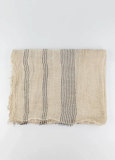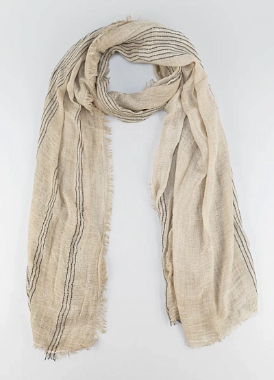 Лёгкий женский шарф нейтральной бежевой гаммы с черными тонкими полосами. Модель выполнена с необработанными краями по всему периметру и имеет свободную драпировку.