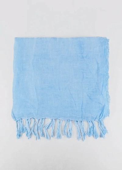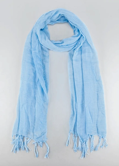 Женский шарф нежно-голубого цвета с бахромой по краям. Лёгкая и воздушная модель, выполненная в однотонной гамме с полупрозрачной текстурой. Прямоугольная форма и удлинённый крой делают аксессуар универсальным в использовании.
