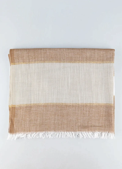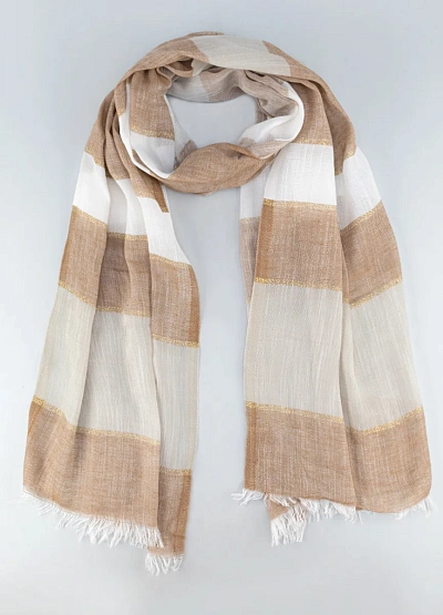 Лёгкий женский шарф прямоугольной формы выполнен в нейтральной цветовой гамме — белый и светло-коричневый с добавлением тонких золотистых линий. Модель украшена широкими горизонтальными полосами и короткой белой бахромой по краям.