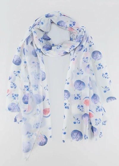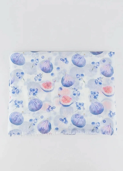 Женский шарф светлой цветовой гаммы с сезонным принтом. Модель выполнена в бело-голубых оттенках с изображением фруктов и ягод, имеет легкую и воздушную структуру. По краям шарфа присутствует небольшая бахрома.