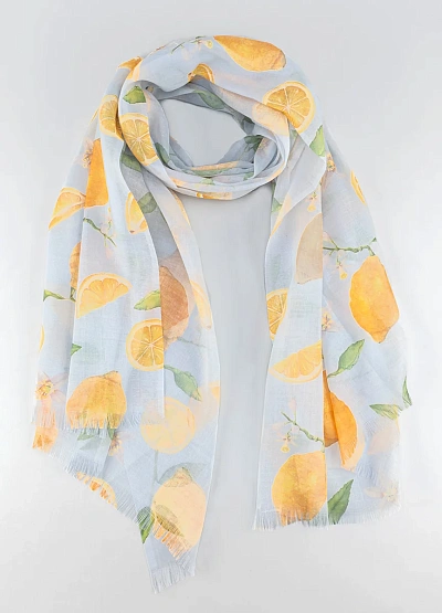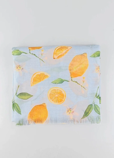Лёгкий женский шарф с ярким цитрусовым принтом выполнен в светлой цветовой гамме с преобладанием голубых и жёлтых оттенков. Изделие имеет свободную прямоугольную форму и короткую мягкую бахрому по краям.