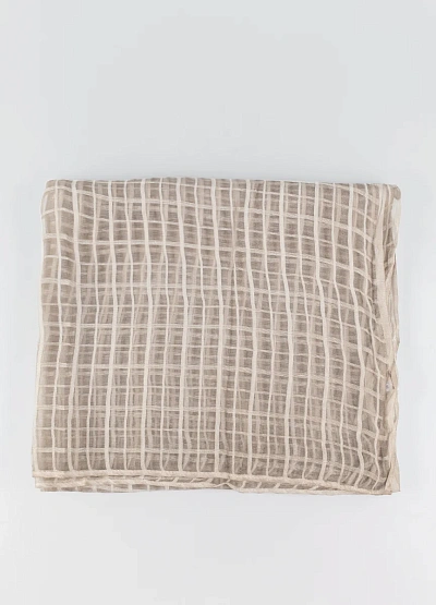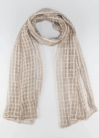 Лёгкий шарф нейтральной цветовой гаммы для универсального использования, выполнен в бежево-молочных оттенках. Украшен выразительным клетчатым узором и отличается полупрозрачной фактурой. Модель прямоугольной формы со свободным драпированием.