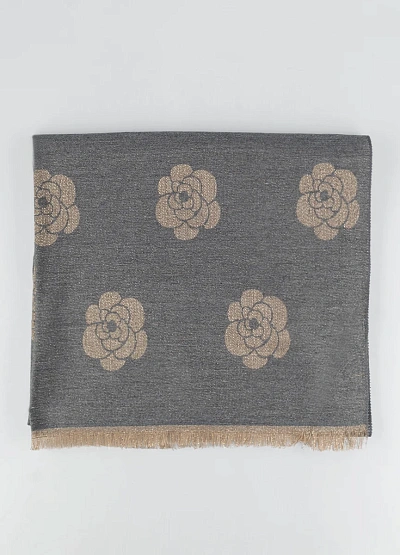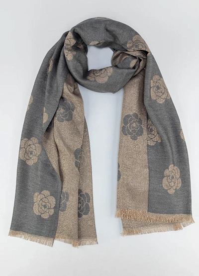 Женский шарф в двухцветной гамме серого и бежевого оттенков с контрастным цветочным узором. Модель украшена принтами в виде крупных цветов и имеет короткую бахрому по краям.