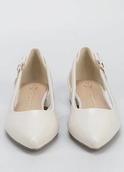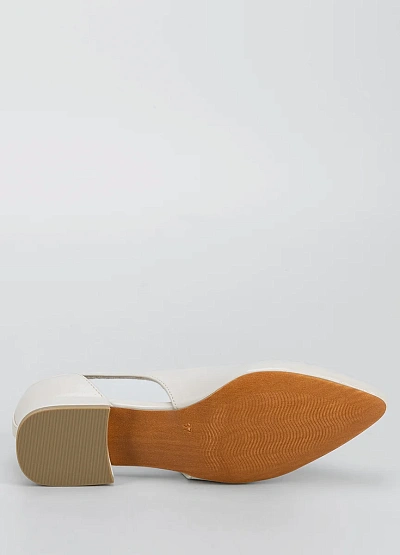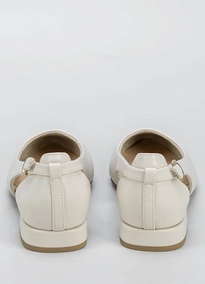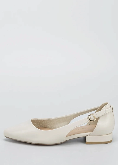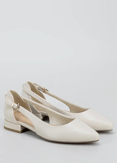 Женские балетки светлого оттенка с закрытым носом и аккуратной открытой пяткой. Модель выполнена в спокойной бежевой цветовой гамме и дополнена ремешком с пряжкой на щиколотке. Минималистичный дизайн подчёркивает универсальность и лаконичность изделия.