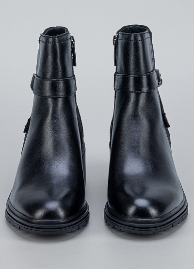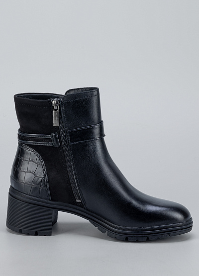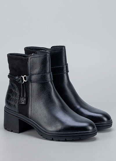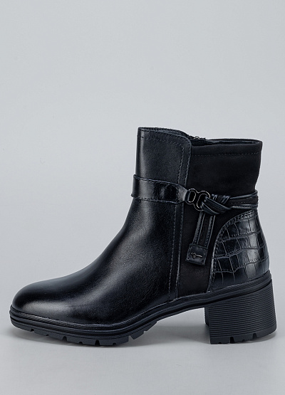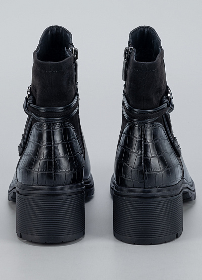 • Элегантные женские ботильоны в глубоких чёрных тонах — универсальная модель, созданная для комфортной и стильной городской жизни. Лаконичный силуэт сочетается с выразительными деталями: вставка под крокодиловую кожу на пятке, аккуратный ремешок и декоративная фурнитура подчёркивают современный характер пары. Устойчивый каблук делает обувь удобной для повседневной носки, а внутренняя отделка обеспечивает тепло и комфорт в холодный сезон.