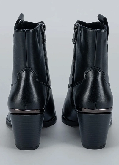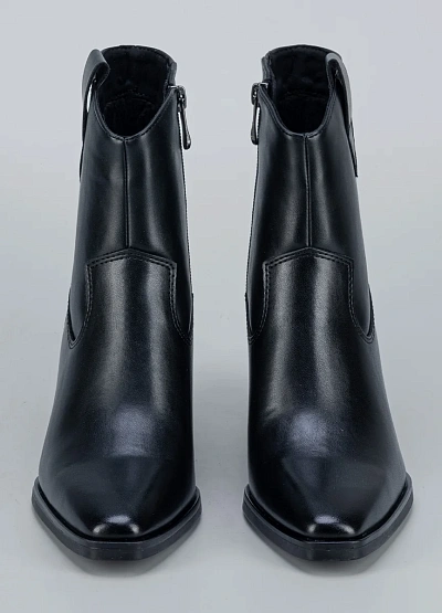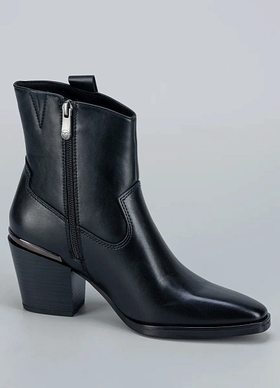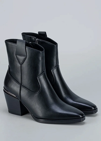 • Женские ботильоны Marco Tozzi в стиле вестерн — смелое решение для модных образов. Модель выполнена из гладкой чёрной кожи и дополнена устойчивым каблуком. Лаконичный дизайн и заострённый нос придают обуви элегантность и женственность.