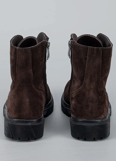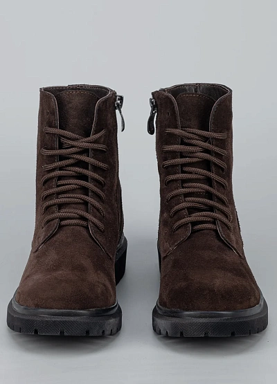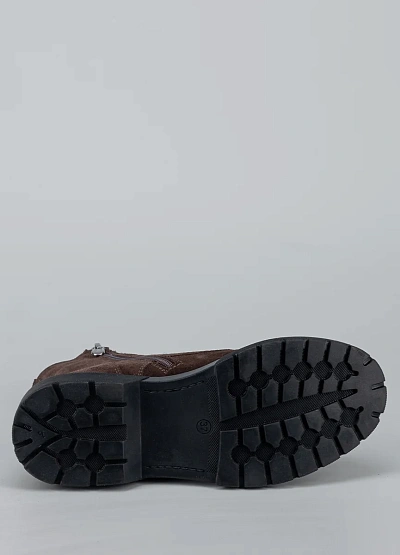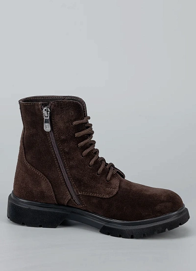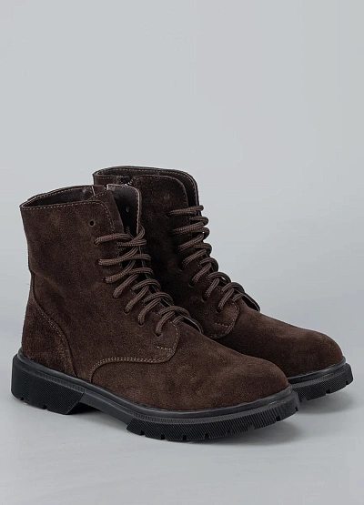 Женские зимние ботинки в насыщенном коричневом цвете выполнены из мягкой искусственной замши и созданы для комфортного ношения в холодный сезон. Модель сочетает практичность и стиль: плотная шнуровка обеспечивает удобную посадку, а боковая молния делает обувание максимально быстрым и лёгким. Протекторная подошва гарантирует устойчивость и надёжное сцепление с поверхностью, делая эту пару отличным выбором для повседневных зимних образов.