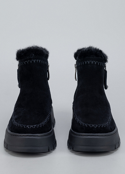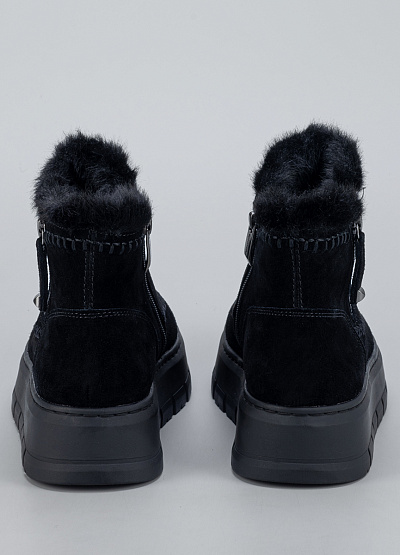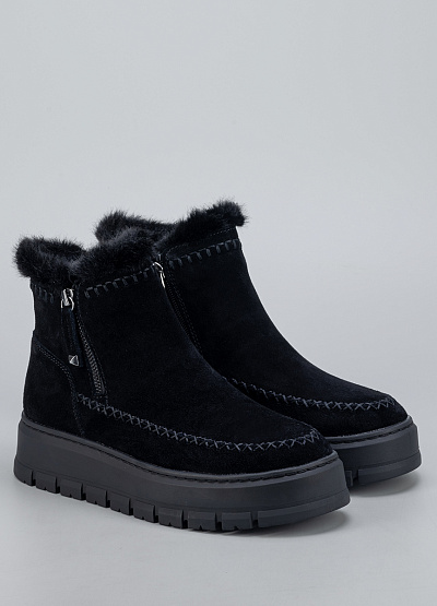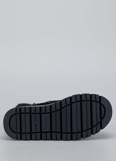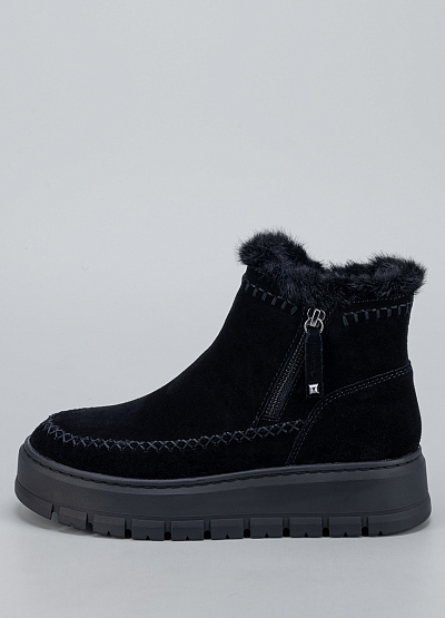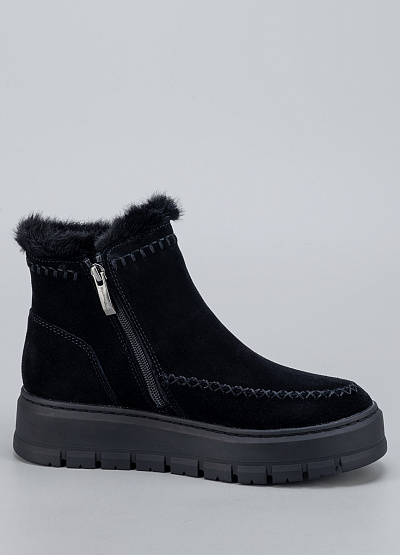 Женские ботинки Tamaris в универсальном чёрном цвете созданы для тех, кто ценит тепло, комфорт и стиль в холодный сезон. Модель выполнена из мягкого замши, украшена аккуратной контрастной строчкой и пушистой опушкой по верху, что добавляет образу уюта и элегантности. Удобная боковая молния обеспечивает лёгкое надевание, а высокая рельефная подошва гарантирует устойчивость и защиту от скольжения.