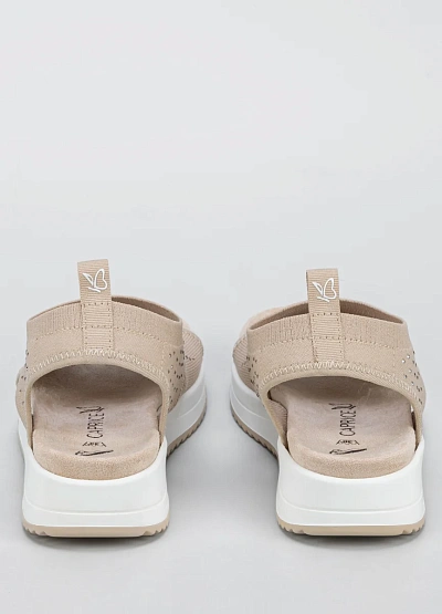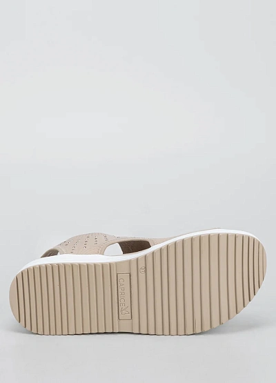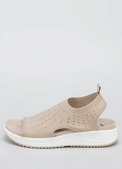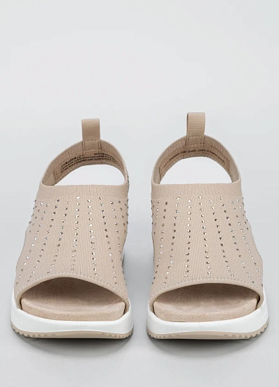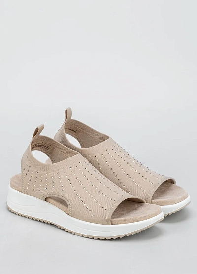 Женские сандалии в светло-бежевой цветовой гамме. Модель с открытым носком, облегающим верхом и декоративной отделкой в виде мелких страз. Легкая подошва обеспечивает комфортную посадку.