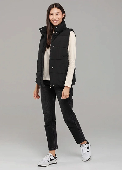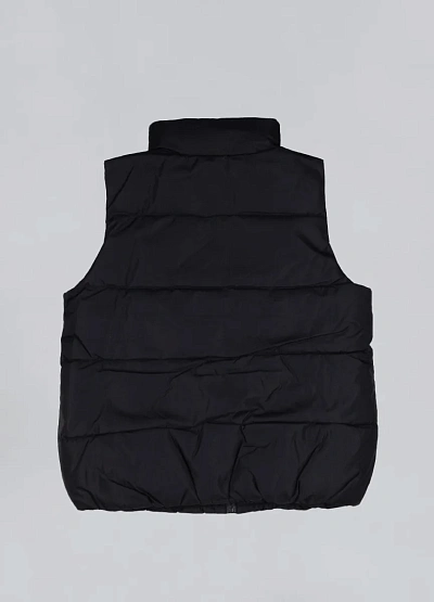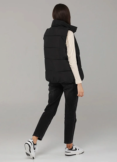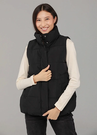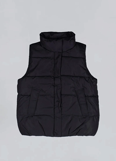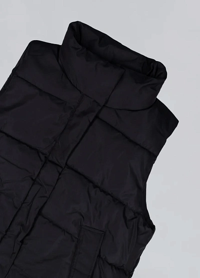 Стёганый жилет с высоким воротником и удобными карманами станет практичным решением для прохладной погоды. Чёрный цвет добавляет универсальности и строгости.