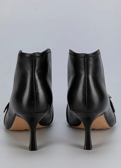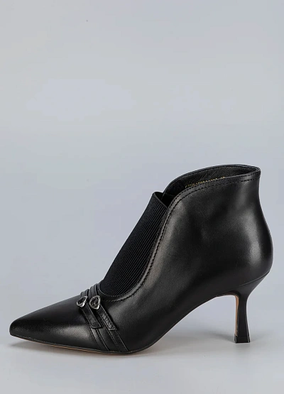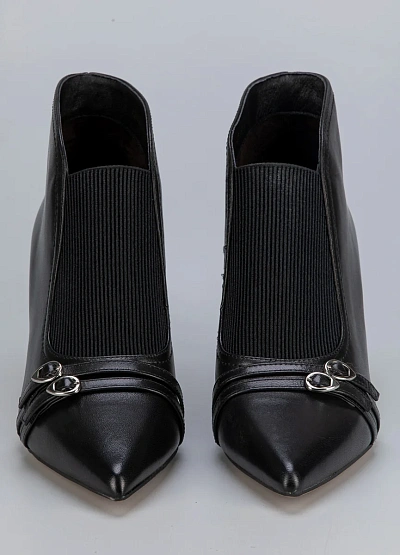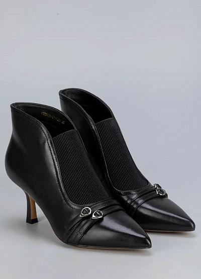 Элегантные женские ботильоны Loretta Very на тонком каблуке — это идеальный выбор для осенне-зимнего сезона. Модель выполнена из гладкой чёрной кожи с декоративным ремешком и металлической пряжкой, что придаёт образу сдержанную утончённость. Заострённый носок делает силуэт более стройным и стильным.