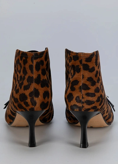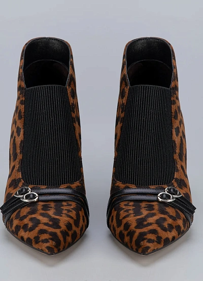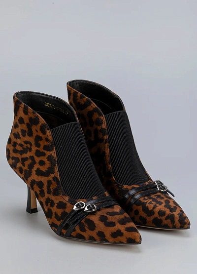 Эффектные ботильоны Loretta Very с леопардовым принтом для смелого и уверенного образа. Выполненные из текстиля под ворс, они дополнены чёрными вставками и ремешками с декоративной фурнитурой. Устойчивый каблук-шпилька и острый нос придают модели выразительный силуэт.