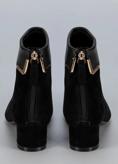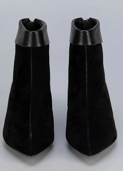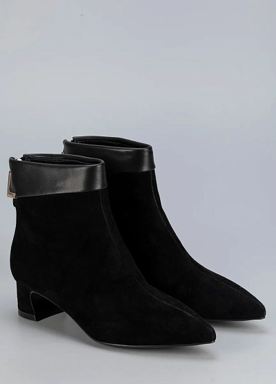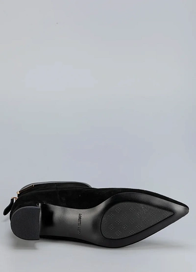 • Женские ботильоны Loretta Very — элегантная модель в чёрном цвете, сочетающая в себе замшевую текстуру и гладкий кожаный отворот с декоративной металлической фурнитурой. Благодаря устойчивому каблуку и зауженному мысу эта пара отлично подчеркнёт женственный силуэт и дополнит как повседневные, так и вечерние образы.