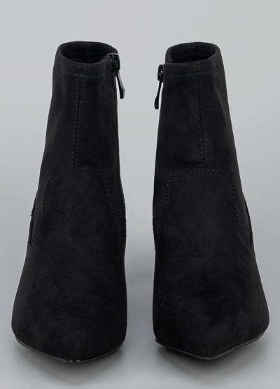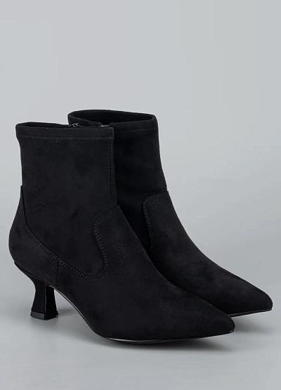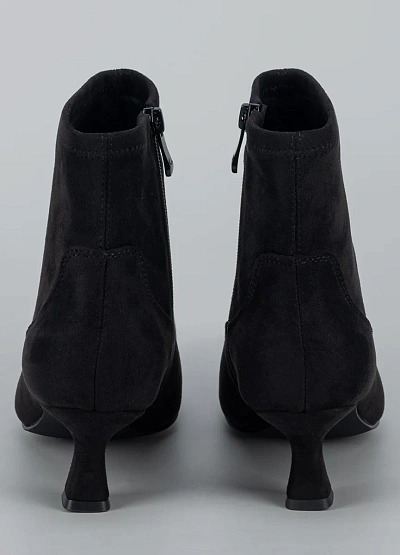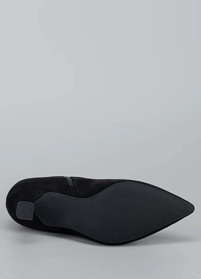 Эти черные ботильоны создают элегантный силуэт, который легко подстраивается под любой образ — от дневной классики до вечерней утончённости. Бархатистая фактура, аккуратный каблук «kitten heel» и изящный носок делают модель женственной, комфортной и невероятно универсальной.