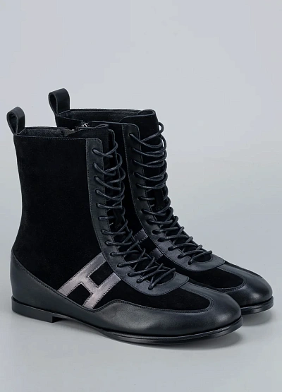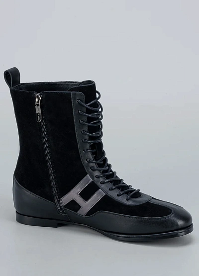 • Женские ботинки Loretta Very — оригинальная модель, сочетающая спортивную динамику и изысканную женственность. Верх выполнен из комбинации мягкой замши и гладкой кожи, что создаёт выразительный контраст фактур. Шнуровка по всей высоте придаёт образу утончённость, а боковая молния делает обувь максимально удобной в использовании. Металлизированная вставка в форме буквы «H» добавляет современный акцент и подчёркивает стиль бренда.