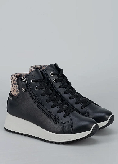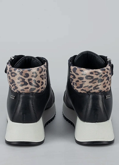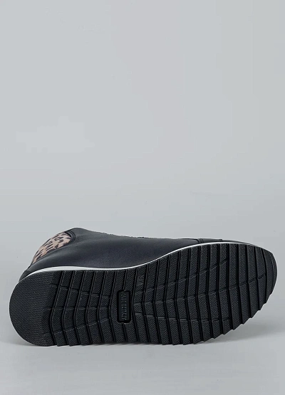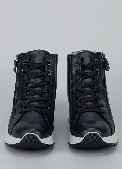Стильные женские кроссовки на приподнятой подошве — современная и удобная модель для активного повседневного ношения. Верх выполнен из гладкого кожзама, дополненного мягким манжетом с леопардовым принтом, что придаёт образу модный акцент. Шнуровка в сочетании с функциональной боковой молнией обеспечивает удобство и точную фиксацию стопы. Приподнятая амортизирующая подошва делает шаги мягче и обеспечивает комфорт при длительной ходьбе.