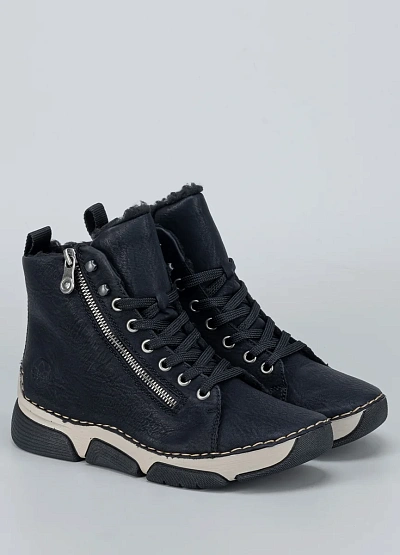 • Женские зимние ботинки Rieker в черном цвете — стильный союз удобства и практичности. Легкая спортивная подошва с контрастными деталями делает образ динамичным, а мягкий меховый подклад дарит тепло в холодное время года. Удобная шнуровка и боковая молния обеспечивают комфорт в носке, а декоративные строчки добавляют модели уникальный характер.