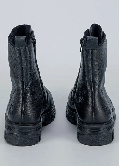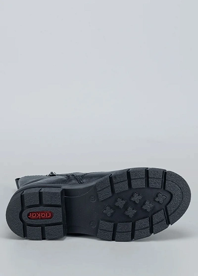 • Женские демисезонные ботинки  Rieker из натуральной кожи с фактурной поверхностью — надежный и практичный выбор на каждый день. Модель выполнена в классическом черном цвете и дополнена удобной молнией спереди, что обеспечивает легкость надевания и снимает обувь. Утолщенная подошва с протектором гарантирует хорошее сцепление и комфорт при ходьбе, а мягкая внутренняя отделка дарит тепло и уют в прохладную погоду.