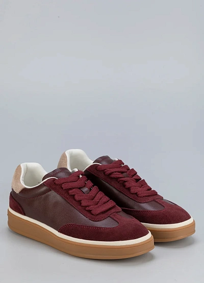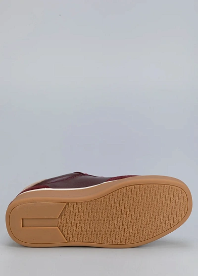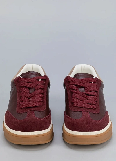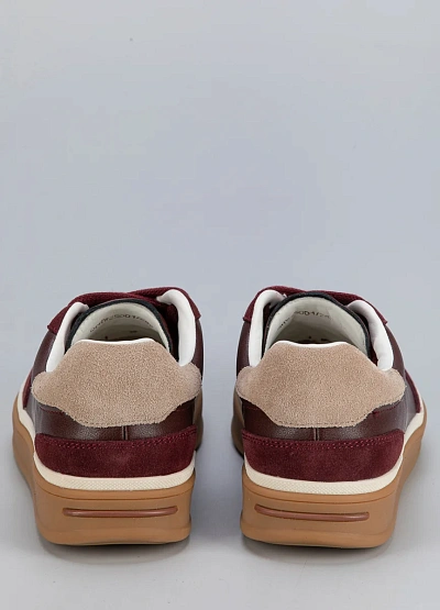 • Мужские кроссовки бордового цвета с гладкой кожаной основой и замшевыми вставками. Модель выполнена в минималистичном дизайне с низкой посадкой и удобной шнуровкой. Контрастная бежевая вставка на пятке и светло-коричневая подошва делают образ более интересным. Удобная колодка и качественные материалы обеспечивают комфорт на весь день.