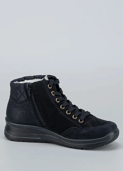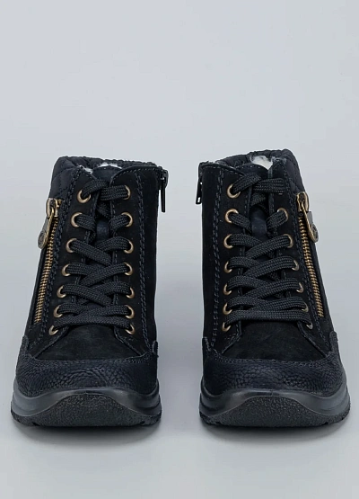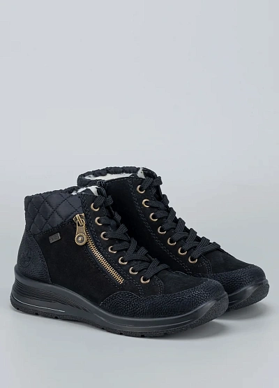 • Практичные и стильные женские кроссовки от бренда Rieker — отличное решение для холодного времени года. Удобная шнуровка и боковая молния обеспечивают комфортную посадку, а утеплённая внутренняя отделка сохранит тепло. Модель выполнена в универсальном чёрном цвете с золотистой фурнитурой и фактурной отделкой по канту.