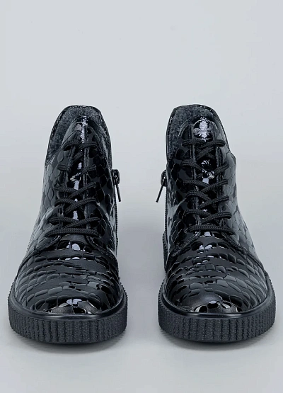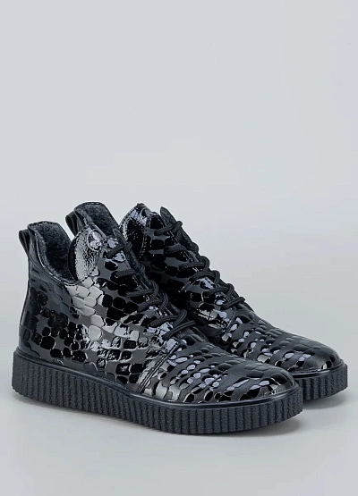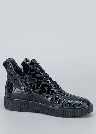 • Женские ботинки Rieker — это сочетание дерзкого дизайна и практичности. Модель выполнена из лакированной кожи с эффектной тисненой фактурой под рептилию, что придает обуви стильный и современный характер. Удобная шнуровка обеспечивает надежную фиксацию стопы, а мягкая внутренняя отделка дарит комфорт в течение всего дня. Платформенная подошва с рифлением добавляет устойчивости и подчеркивает трендовый силуэт.