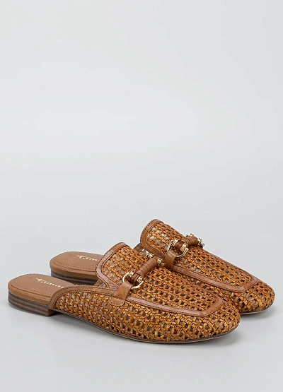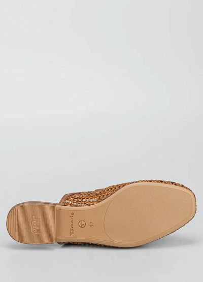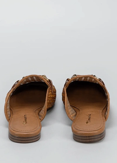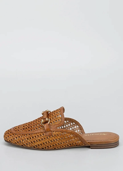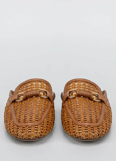 Женские открытые мюли коричневого цвета. Модель выполнена в плетёном стиле с декоративной вставкой спереди и открытой пяткой.