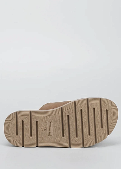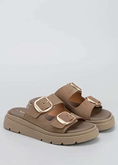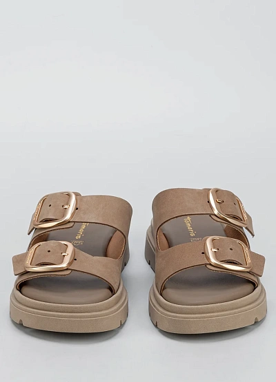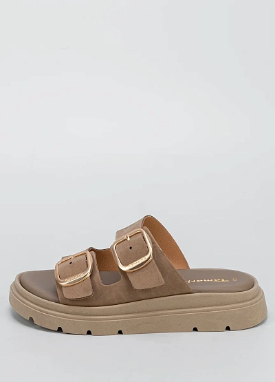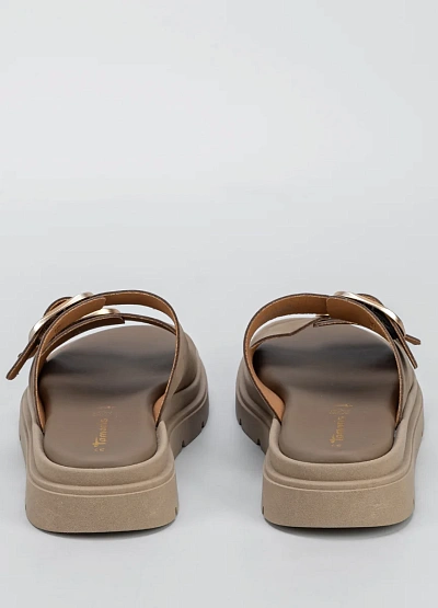 Женские пантолеты нейтральной бежево-коричневой гаммы, выполненные с открытым мысом и двумя широкими ремнями с пряжками. Модель отличается закрытой пяткой и массивной подошвой с рельефным профилем.