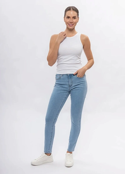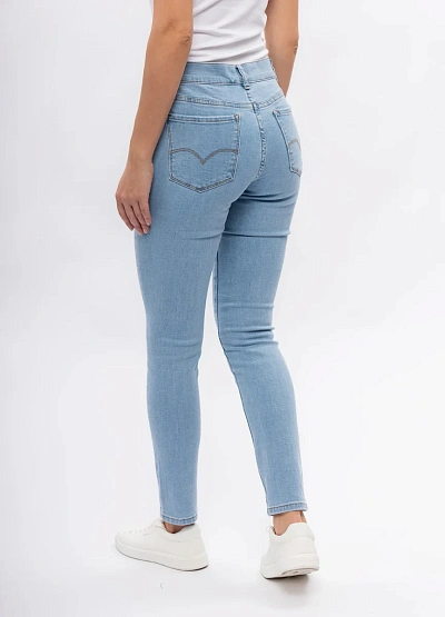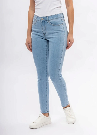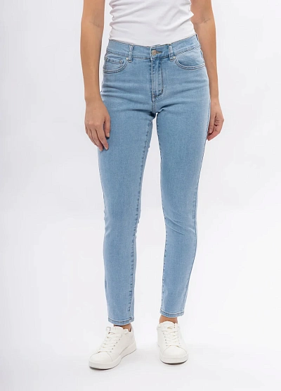 Женские джинсы светло-голубого цвета с классическим кроем. Модель оснащена стандартной застёжкой на пуговицу и молнию, пятью карманами и средней посадкой. Дизайн выполнен в лаконичном и универсальном стиле.