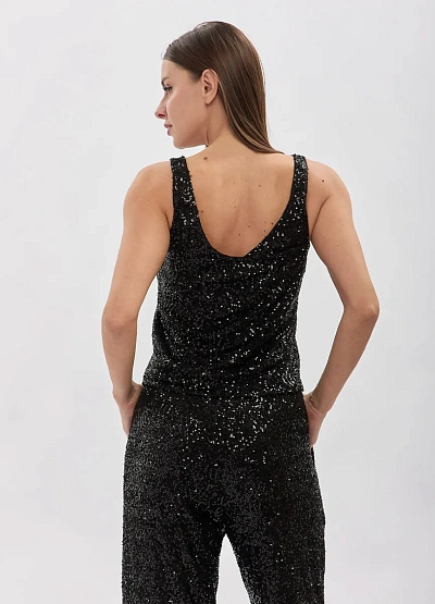Топ — стильная и эффектная модель, полностью расшитая блестящими чёрными пайетками. Он мягко переливается при каждом движении, создавая выразительный вечерний акцент. Лаконичный крой с V-образным вырезом подчёркивает линию шеи и визуально вытягивает силуэт, а широкие бретели обеспечивают комфортную посадку. Топ легко комбинируется с брюками или юбкой из пайеточной коллекции, формируя гармоничный праздничный образ.