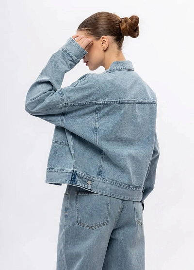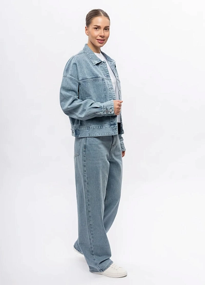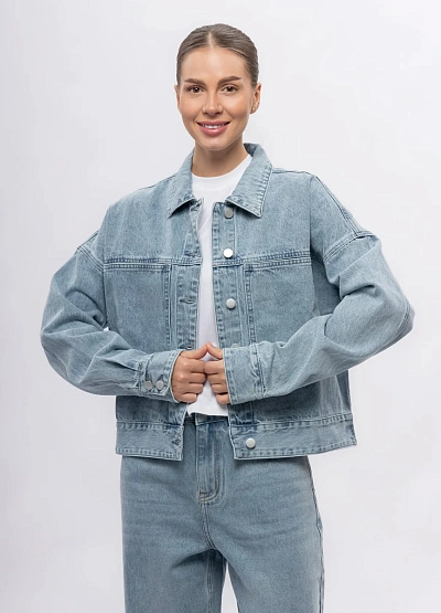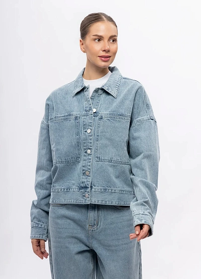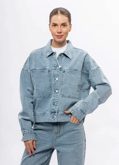 Женская джинсовая куртка свободного кроя в светло-голубой цветовой гамме. Модель отличается прямым силуэтом и крупными накладными карманами спереди, а также классическим воротником и застёжкой на кнопки.