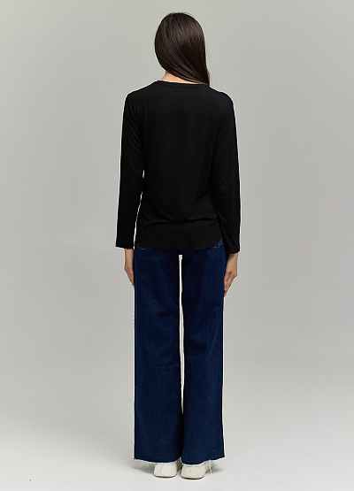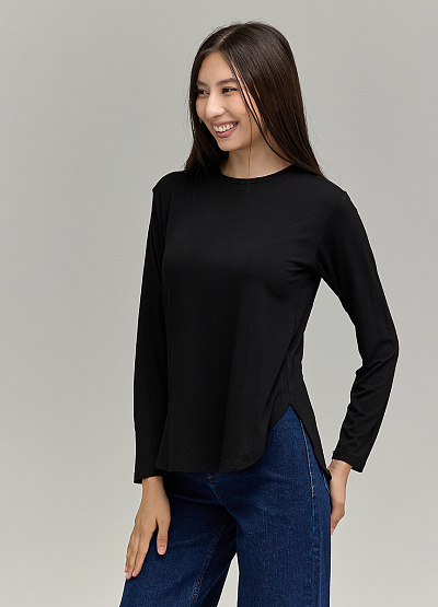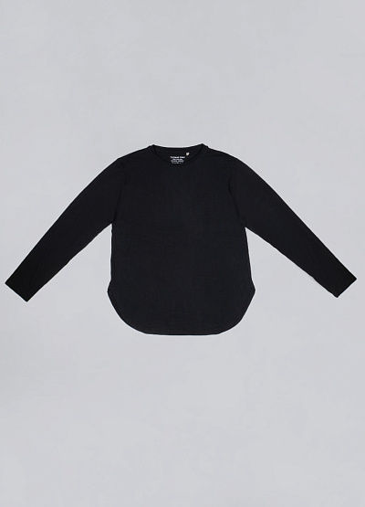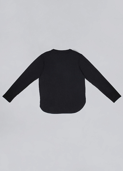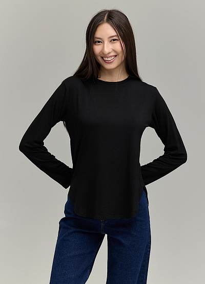 Чёрный однотонный лонгслив с длинным рукавом — необходимая вещь в любом гардеробе. Идеален как самостоятельный элемент и как базовый слой под жакеты, жилеты и кардиганы.