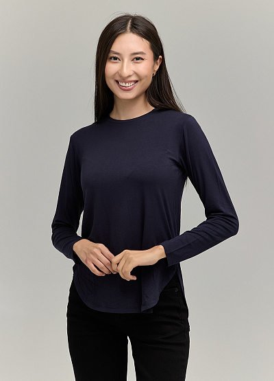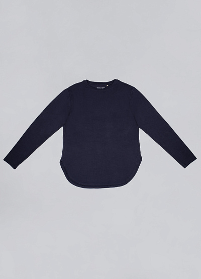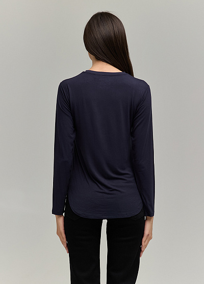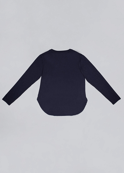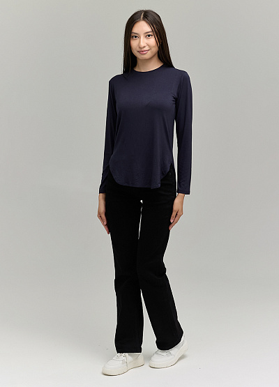 Минималистичный лонгслив с длинным рукавом и округлым вырезом станет универсальной вещью в гардеробе. Синий оттенок придаёт образу глубину и стиль.