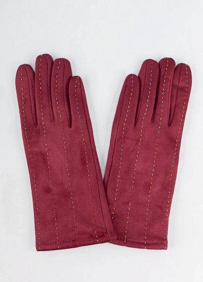 Эти женские перчатки выполнены в насыщенном бордовом цвете и имеют прямой классический крой. Модель украшена декоративными рядами цветных стежков, идущих вдоль всей длины перчаток, что придаёт им оригинальный и современный вид.