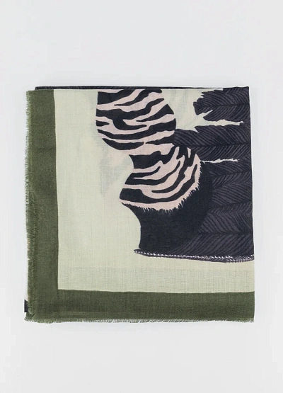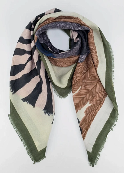 Женский шарф с комбинированным принтом выполнен в зелёной, чёрной, коричневой и бежевой цветовой гамме. Модель представлена с абстрактными полосами и рисунком, края шарфа имеют легкую бахрому.
