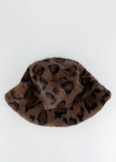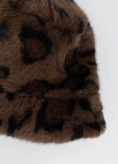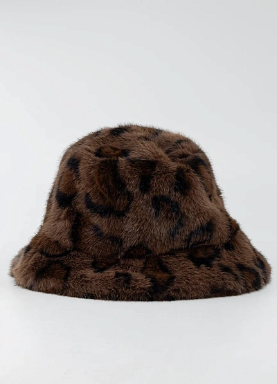 Женская панама тёмно-коричневой гаммы с анималистичным принтом. Модель выполнена в пушистом фактурном исполнении, с закруглёнными плавными линиями и мягкой формой.